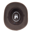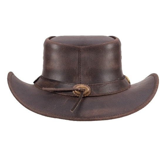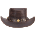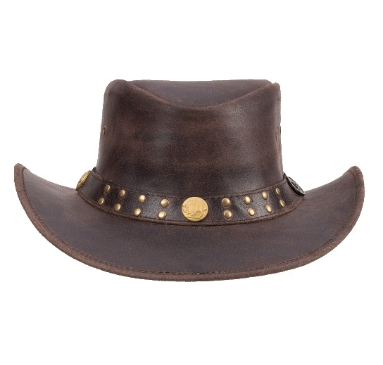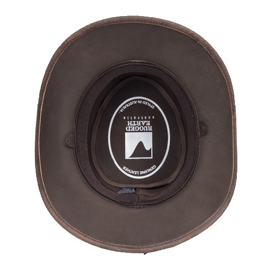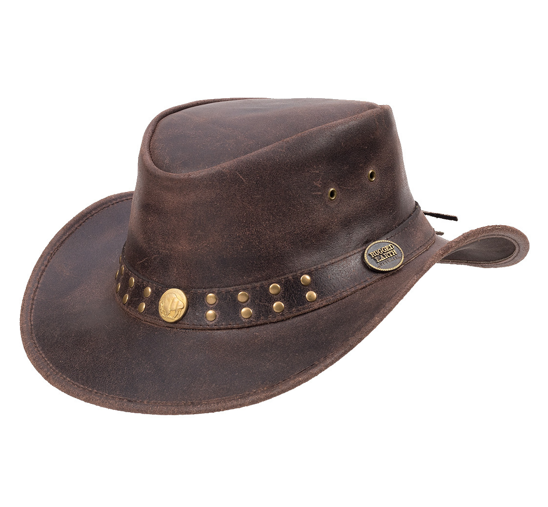 Klobouk je vyroben z pevné pravé hovězí kůže, která dobře drží tvar a zvládne i náročnější podmínky. Dominantním designovým prvkem je nýtovaná kožená stuha s kovovými detaily a logem Rugged Earth, které podtrhuje jeho drsný westernový a outbackový styl.