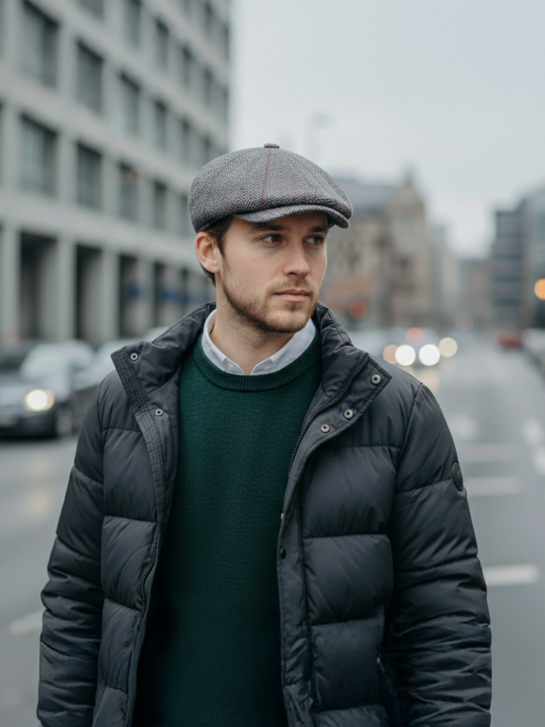 Šestidílný design zajišťuje dynamický střih, který se perfektně hodí k městskému i klasickému outfitu. Detailní vzor rybí kosti dodává klobouku nadčasový, elegantní nádech a harmonicky spojuje tradici a modernost.